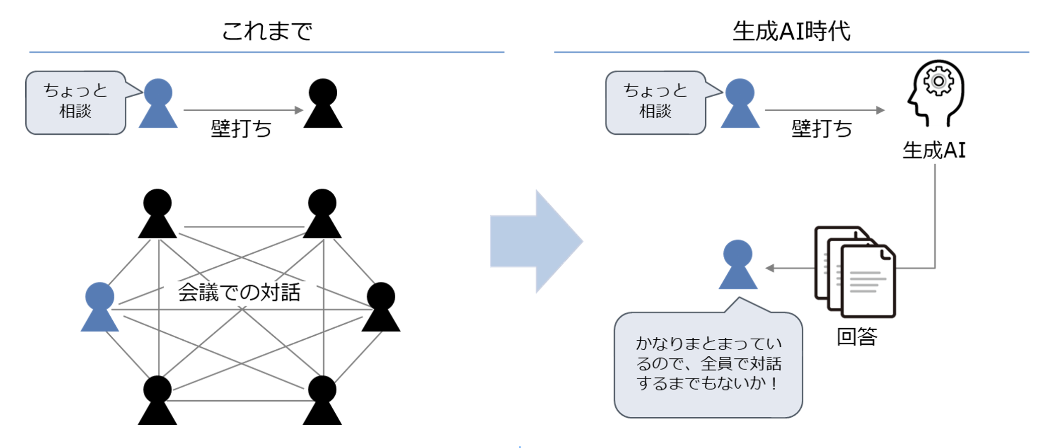 しかし、生成AIの登場によって、「相談や会議」の在り方そのものが大きく変わろうとしています。これまでは、相談したいことがある場合、「ちょっと相談したいんだけど、時間もらえる?」といった形で対話が始まっていましたが、現在ではまず生成AIを壁打ちの相手として、「ちょっとした相談」を自分と生成AIの間で完結させるケースが増えています。つまり、人とのコミュニケーションの機会がさらに減少しているのです。